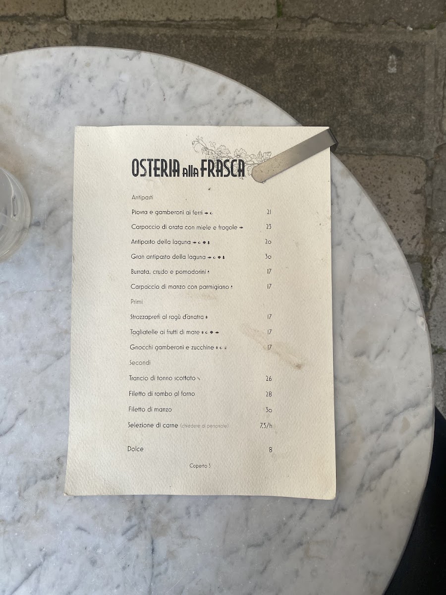 “ We had dinner here on our first night in Venice, it was across from our hotel qnd seemed like a nice place. The side is blocked by the water bus stop so the sight is not as nice as could be, although still generally romantic. The service was attentive and quick, they unfortunately do not serve tap water and we were made to order bottled water instead, but it wasn’t too much of a hassle. The meal itself was good enough, the seafood pasta is particularly good. The cuttlefish polenta was different, it was still good but not too engaging. The least satisfactory dish however, was the pasta of the day dish, which this time was sea bass with a pistachio based sauce. It fell quite a bit short and was bland to the taste. The pasta dishes range from 20-25 euros, while the larger main courses are 25-35. Entrees will be around 15-20 mostly. Overall a satisfactory meal, although I wouldn’t rank it too spectacular. ”